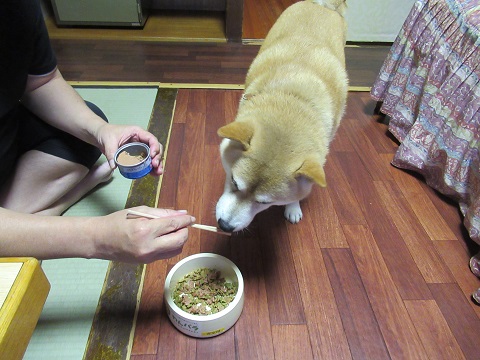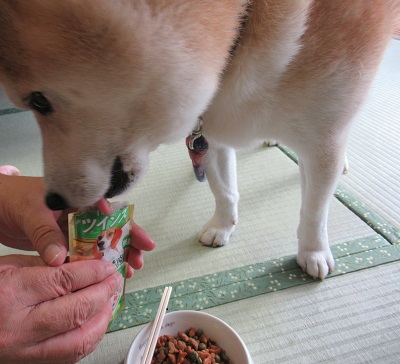 会席料理旅行記の続きです。今日は松阪わんわんパラダイスでの夕食を。食事に行く前にゴンも夕食。鶏のササミのレトルトをトッピング。入れている横からガツガツです。そして、私たちの夕食は、お食事処「桔梗」で。このような席でした。ゴンはここに。こちらがお品書き。会席料理です。食前酒のメロン酒。前菜。椀物。お造り。天ぷら。鮎の塩焼き。冷鉢。酢の物。メインは松阪牛の陶板焼き。松阪牛、とろけました。ライス、赤だし、漬物。食べている間のゴンの様子。グッスリです。デザートのあんみつ。美味しくいただきました。量もちょうど良かったです。お利口だったゴンにおやつ。旅行記は今日はここまで。明日に続きます。