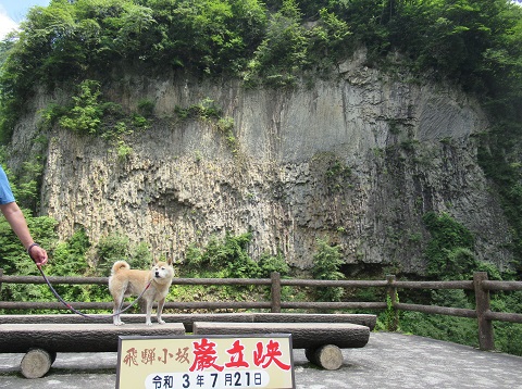 小坂の滝めぐり旅行記の続きです。下呂2日目の午後は1か所観光へ。「巌立峡」です。下呂には何度も行っているのですが、初めて行きました。この巌立峡、がんだて公園の滝見遊歩道の入口、駐車場のすぐ近くにあります。この岸壁の感じ、凄い迫力です。そして、そのまま滝めぐりに行きます。小坂の滝めぐり、いくつかのコースがあります。私たちはゴンも連れていることもあって、一番短い30分コースで。1人300円の協力金を支払って、遊歩道を行きます。入口から見た遊歩道の様子。木がかなり茂っています。三ツ滝まで250mの看板が。この三ツ滝を目指します。ではゴンと行きましょう。途中にあった看板。パワースポットと書かれた場所がありました。遊歩道から巌立峡が一番近くで見られるところだからかな。パワーをたくさん浴びましょう。ワンコ連れが利用するのかな?クンクンチェック中~。石畳の道になりました。すぐ横には川が流れています。7月だったけど涼しい~。今度は鉄板の遊歩道。滝が見えてきました。行者橋に到着。ここが30分コースの折り返し地点になります。そしてこれが三ツ滝。滝が3段になっているからそういう名前がついたのですね。ゴンも見てますねぇ。小坂の滝めぐり、まだまだ先はあるのですが、我が家はここでUターンします。帰りに川に降りてみました。ごまかしながらゴンを川に誘導。でも嫌がって、すぐに上がってきました。やっぱり水嫌いは克服されていませんね。小坂の滝めぐりはこれで終了。この後は駐車場に戻ります。旅行記は今日はここまで。明日に続きます。
