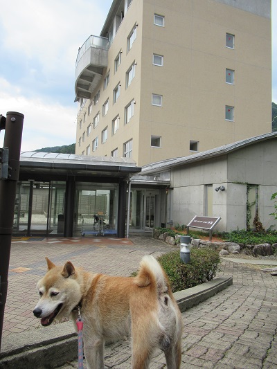 Dog Villa旅行記の続きです。下呂温泉に到着。宿泊先のホテルへ。今回の宿泊先は「ポイントバケーション下呂」です。会員制のホテルなのですが、今回一般も宿泊できるプランが出ていて、予約しました。ホテル前に「Dog Villa」があり、わんこ同伴で宿泊することができます。今回はここで2連泊します。ホテル全体はこんな感じ。奥がホテルで、手前に建っているのがDog Villa。Dog Villaは1階建てです。Dog Villa入口。ワンコの匂いがするのかゴンはクンクン。先にお父さんだけ入ってチェックイン。ホテル側に入ります。ロビー。売店。 モネの池の絵が飾られていました。チェックインを済ませ中に入ります。入口には足洗い場が。ホテルとDog Villaの間に広い庭があったのですが、ワンコはNGでした。ここ、ドッグランだったらいいのに、と思いました。ではVillaに入って部屋に行きます。こういう廊下です。部屋は3部屋だったかな。私たちは真ん中の部屋でした。部屋の中へ。長くなるので今日はここまで。部屋の中については明日にします。