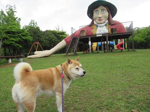 ドッグラン帰りのお散歩先日のドッグランに行ったあと、買い物のはしごをして、帰りにもう1か所お散歩のため公園に寄りました。いつも利用している、「宮リバー度会パーク」です。広い公園で、お散歩するにはGOOD。度会町はお茶が名産で、水飲み場が急須。ここでは河津桜、ソメイヨシノと春の花が楽しめましたが、今の時期は新緑の緑が綺麗です。他にもたくさんのワンコがお散歩中でした。左奥の木の下に柴犬発見。長いリードでボール遊びを楽しんでいました。ズームで。遊具もたくさんあります。写真はないけど、奥の広場はチビッコ広場で、もっとたくさん。GWは賑わったでしょう。この日はメガドンキに寄って、お弁当を買ってきました。お父さんは牛カルビ焼肉弁当、私は鮭のっけ海苔弁当。お父さんは「コケコッコー共和国」のチキンカレーも。この日の夕食です。チキンカレー、味見させてもらったけど、そんなに辛くなくて、私好みの味で美味しかった。