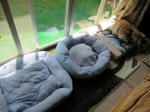 ゴンベッドを衣替えGWも後半。後半はいいお天気が続きそうですね。我が家はGWはお出かけ予定はありません。どこも人でいっぱいだし、渋滞はするし。今日はお布団を干して、シーツやマット類を洗濯。夏用のひんやりマットに交換です。本来ならこたつ布団やホットカーペットマットも干して、片付けてしまいたいところですが、最近朝晩肌寒くて、まだ片付けられないでいます。さすがに電気は点けませんが、足にこたつ布団をかけるだけでも暖かいですからねぇ。でもゴンのベッド、さすがにもう昼間は冬物は暑そうで、夏仕様に交換しました。窓際に3つ並べて。毎年新しいベッドを買うので、つい増えてしまうゴンベッド。捨てるのももったいなくて、並べられるだけ並べています。ゴンはその時の気分で、あっちに寝たりこっちに寝たり。昨日はお出かけだったので、寝不足なのか疲れているのか、今日は寝てばかりです。明日は車を夏仕様に衣替えする予定。まだ毛布を敷いたままなので。車のゴンベッドも冬物だし。本当はお父さん、今日したかったみたいだけど、私は今日は家の方をしたかったので。こたつ、少しくらい肌寒くても明後日片付けようかな。スイッチが入った時に一気にやってしまいたいし、着る物やひざ掛けなどで調整できますからねぇ。