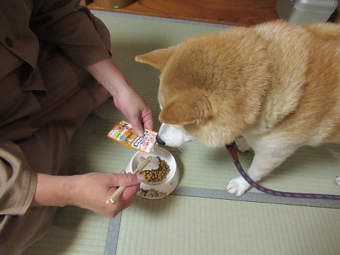 おやつに混ぜて昨日は予定通り、お薬を飲ませました。ゴン、お薬だよ~。そのままでは当然吐き出してしまいます。なのでどうやって飲ませようか・・・、と考え、昨日買ってきたこちらのおやつに混ぜてみることに。お薬を小さく割って、ジャーキーに混ぜます。ジャーキーも同じくらいの大きさに切りました。これだったらゴンも分らないかも。ゴン、おやつだよ~。待て~。よしっ。パクパクと食べ始めました。途中、お薬にあたった時かな?考えるようにモグモグ。そのまま食べ進めていきます。だんだん減ってますねぇ。食べ終わり~。お皿の中は空っぽ。お薬も残っていません。無事、お薬飲み終わりました。これで1か月安心だね。今日は朝から雨。朝散歩のときは小雨だったけど、今は本降りです。夕方くらいからは大雨になるような予報で、今日は夕方散歩早めに行かないと。