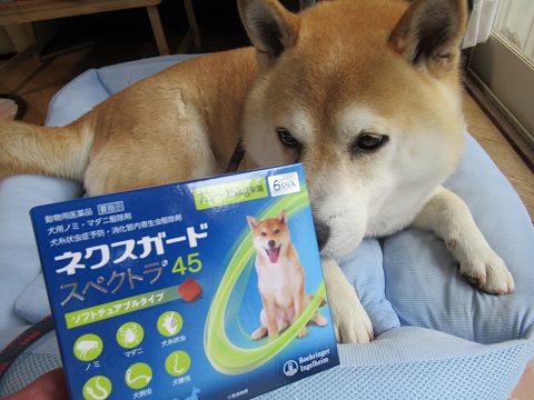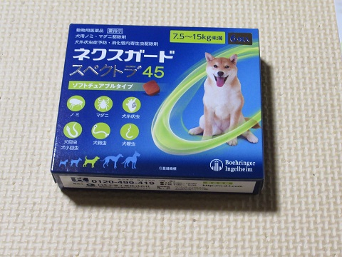 ネクスガード今日は動物病院へ行ってきました。ノミダニとフィラリアのお薬、「ネクスガード」を購入するためです。我が家がいつも使っているのはこちら。「ネクスガード スペクトラ45」、ソフトチュアブルタイプ、7.5~15kg未満です。いつものように1箱。中には6か月分、6個入っています。6個ではワンシーズン足りないのですが、いつもこれを使い切ってから、足りない分、1~2個を追加購入します。お値段、ビックリするくらい高いです。1箱6個で17160円。1個が2600円+消費税です。ゴンの健康のためには仕方ないですね。毎年もらっているカレンダーがサービス。いつもエコバックとかもあるんだけど、今年はありませんでした。今日はもう夕食済ませてしまったから、明日飲ませようと思います。そのままでは飲んでくれないので、毎回どうやって飲ませようかと悩みます。明日はどうやって飲ませようかな。