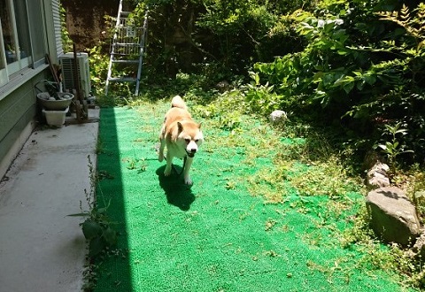 おうちドッグラン昨日は曇りで、小雨が降ったりやんだりしたお天気でしたが、今日は快晴。太陽がまぶしいです。風があるのでそれほど暑くもなく、カラッとしています。風が涼しい~。今日は午前中、ゴンもお庭で遊んでいました。狭いながらも自由に走れるので、ゴンも楽しそう。ちょっと草が生えてきていますが、そのうち草取りしますのでスルーしてくださいね。風が涼しいので大丈夫かな、と思い、先ほど2回目のお散歩行ってきたのですが、やっぱり歩くと暑いですね。ゴンもハァハァ言ってきたので、いつもの半分くらいの距離でUターンしてきました。また日が落ちてから3回目のお散歩行こうと思います。