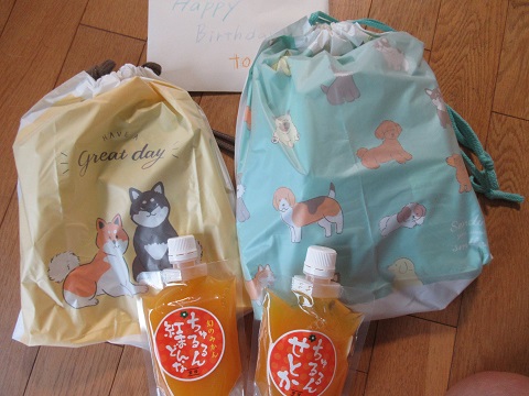 ありがとう~♪今日は私の誕生日です。この歳になると、別にめでたくもないのですが。昨日の夕方、郵便屋さんが小包を届けてくれました。いつも誕生日にはプレゼントを送ってくださる、柴犬仲間のブログ友、「みつぼんさん」からです。みつぼんさん、いつもありがとう~。小包の中身はこちら。袋がまた可愛い。ひとつ目の袋には、可愛い柴犬スリッパが。他には小さくたためるエコバックとか、香りの瓶詰とか、うちわ。2つめの袋には、ゴンの大好物のちゅーる&ちゅるビーがいっぱい。みつぼんさんの地元、愛媛の特産品のせとかと紅マドンナのゼリー。🍊盛りだくさんの楽しいプレゼントありがとうございます。ゴン、みつぼんさんからゴンにだよ~。こんなにいっぱい貰ったよ~。さっそく1本あげてみました。ちゅるビーを。1本にこれだけ入っています。明けた途端に起きてきてソワソワ。いつものフードにトッピング。待て~。よしっ。ガツガツでした。あっという間の完食。美味しかった~、の舌ペロです。ゴンよかったね。みつぼんさん、本当にありがとうございました。昨日スマホにパソコンから到着メール送ったんだけど、調子悪くて何度もエラーになって。きっと送れてませんね。ここで到着のご報告させていただきます。毎年誕生日、覚えていてくれて感謝感激です。今後もよろしくお願いします。