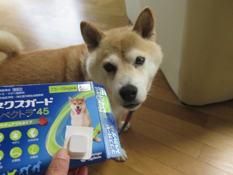 ネクスガード今日はお薬の日でした。ノミダニ・フィラリアのお薬、「ネクスガード」です。さあ、今回はどうやって飲ませようかな。今回はウインナーに忍ばせることに。こんな感じです。さあ、食べてくれるかな?ゴン、大好物のウインナーだよ~。待て~。よしっ。なんかいつものウインナーと食感がちょっと違うなぁ、とでも思っているのかな?あっという間の完食でした。美味しかった~、の舌ペロです。今回も無事飲んでくれました。これで1か月安心だね。