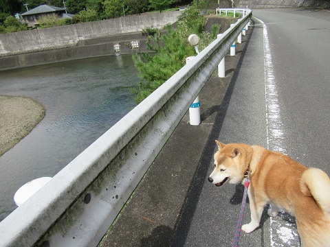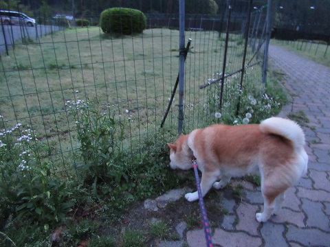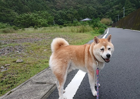 台風前のお散歩台風が来ていますね。現在は山口県あたりのようですが、こちら三重県、我が家あたりも、昨日くらいから風が強くなって、雨が降ったりやんだり。今日は強風警報が出ていて、かなり風が強くなっています。雨は相変わらず降ったりやんだり。どちらかというとやんでいる時間の方が多く、今のところお散歩も普通に行けています。これから雨風ともに強くなるのかな?こちらのピークは今夜から明日早朝にかけて、とのことです。先ほど、雨のやんでいる間に、ちょっと早めの夕方散歩に行っておきました。風がかなり強く、周りの木や草が揺れています。ゴーゴーと風の音。何か飛んでこないかと、少し怖かったです。さすがにこういう日なので、他にお散歩しているワンちゃんはいなかったです。夜は雨風がもっとひどくなるだろうし、夜散歩は自宅周辺で軽く2、3回オシッコさせる程度かな。台風でも我が家、お散歩は必須。ゴンは室内ではオシッコしないので排泄のためです。台風の影響で蒸し暑く、窓も開けられないのでエアコン点けっぱなしです。お散歩以外は寝てばかりのゴンです。