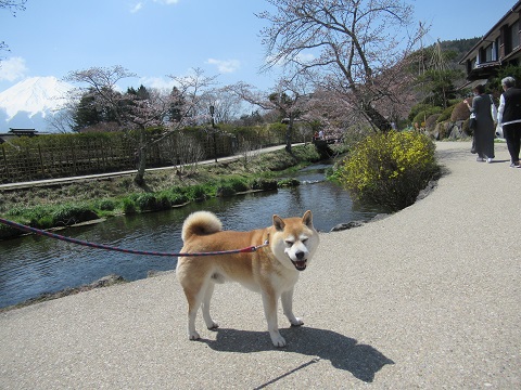 お釜池までお散歩旅行記の続きです。「忍野八海」を観光中です。湧池を一通り観光した後は、もう1か所お散歩を兼ねて他の池を見に行こうと思います。こういう川沿いの道を歩きます。バックには富士山。雲が大分取れてきて、富士山が綺麗に見えてきました。ところどころに植えられた桜も満開で綺麗です。途中で水分補給。お釜池の看板が。ここを目指しています。桜が綺麗なところで1枚。お釜池に到着。まず看板前で。こちらがお釜池です。意外と小さかった。来た道を戻ります。途中でまた他の池もあったのですが、ここまでにしました。またまた別の柴ちゃんと遭遇。今回も上手にご挨拶できました。車に戻る前に、再度湧池で富士山をバックに。ゴン抜きで富士山だけを。旅行記は今日はここまで。明日に続きます。