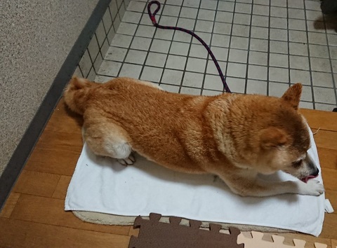 台風15号昨日からこちら地方、大雨です。今朝、大雨をもたらしていた熱帯低気圧が台風に変わりました。3連休だというのに、電車は泊まったし、主要道路も通行止めになりました。ピークは今晩なのかな?まだまだ雨は降り続きそうです。そんな大雨でもゴンのお散歩は必須です。今日の朝散歩、様子を見ながら、ちょっとマシになった時を見計らって行ってきました。ちゃんとうんPもしてくれてよかった。最初は玄関で、身体に着いた雨の雫をペロペロ。その後はバスタオルで拭き拭き。なんとか朝散歩は行ってきたけど、夕方散歩はどうなることやら。夕方にはどうかこれ以上の大雨にはなっていませんように。