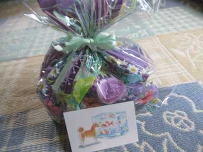 毎年ありがとう~私事ですが、今日は私の誕生日でした。そんな中、郵便屋さんが荷物を届けてくれました。送ってくださったのは、柴犬「弥勒(みろく)くん」のお母さん、「みつぼんさん」からです。毎年誕生日にはプレゼントを贈ってくれます。みつぼんさん、今年もありがとうございます。届きました~。可愛い柴犬グッズがたくさん。さっそく紹介させてくださいね。素敵なラッピングの中に入っていたものは・・・、たくさんの柴犬グッズです。みつぼんさん、ほんと柴犬グッズを見つけるのが得意で、見たことがない柴犬グッズばかりです。これらともうひとつ包みが。こちらは開けたとたんにヒノキのいい香り。アロマオイルがついていて、これにアロマオイルをつけるとさらにいい香り~。さっそくリビングに設置しました。こちらの柴犬の置物も可愛い~。こちらは玄関に設置しました。フワフワの柴犬タオルに、スリッパ型の柴犬ぬいぐるみ。柴犬ソックスに、コーヒーまで。盛りだくさんの柴犬グッズ、もう感動ものです。とっても嬉しい~。みつぼんさん、本当にありがとうございました。大切に使わせていただきますね。お祝いコメントを書いていただいたポストカードも柴犬。ほっこりさせていただきました。