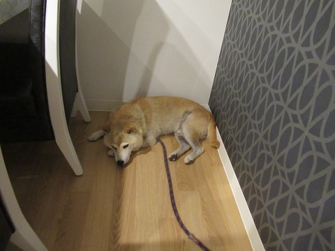 食べている間お腹一杯のゴンはダイニングテーブルの隅っこに。