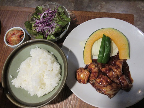 サラダ、キムチ、焼き野菜、スープ、ライス付きで950円。