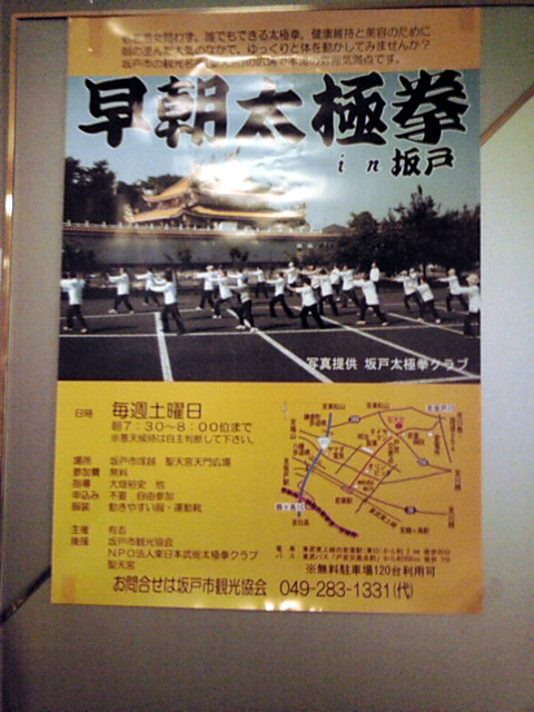 毎週土曜の朝に近所の坂戸市聖天宮にて早朝太極拳が行われることになったらしいです…さっそく是非とも参加するぞー!!!って思ったらその日は子供の授業参観で朝のあわただしい時間だ…(´Д`)いけなくて悔しいですっ_| ̄|○でも来週行きたいですっ!