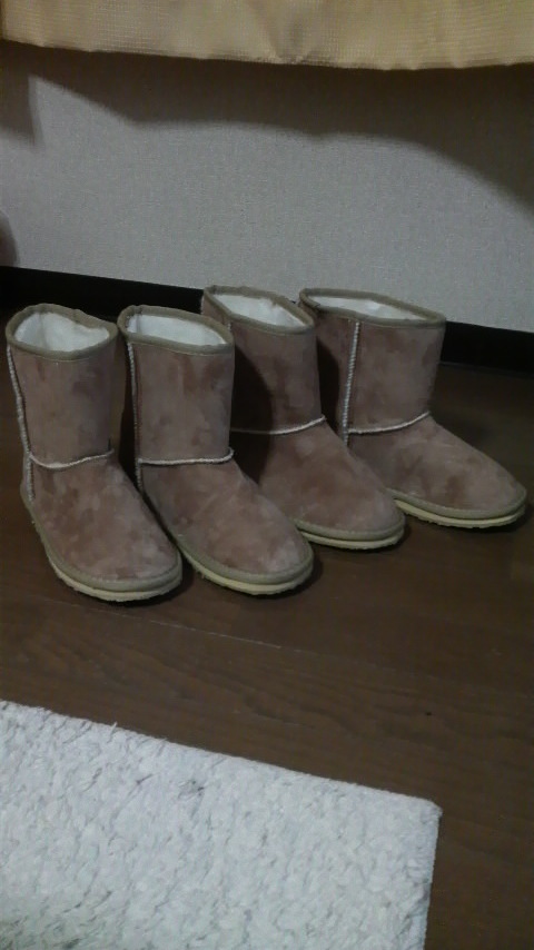 昨日から今日にかけて大忙し~ママ業、女業、一般人業、彼女業~~笑(ママ業)昨日は二女少4の娘の参観and学校祭のお手伝い~で学校へお手伝い言っても全員参加の手伝いなので、役員なんかはやってませぇ~んが!ちょうど転職一日目が前回の参観日にあたりまして。。。前回ブ~ブ~文句言われ。。。それでも辞退いたしました参観。今回挽回!!上の姉ちゃん。4年生あたりはもぉこなくていいよ。来てる人少ないし~なんて冷めた感じだったんだけど~二女は私が大好き!!(ママの勝手な推測ですがぁ~笑)いまだに来てほしいほしいと嬉しい事を言ってくれまぁす!!帰ってきて久しぶりに家族全員昼から集まったので(長女が家にいるのは珍しい。部活部活で忙しい人なので。)ちなみに長女1年生から2年生の今までで~2回目のズル休み~そぉんなに疲れてるんだから~たまぁにズル休みしたらぁ??そそのかしたのは。。。。私です。。。笑こんなお母さんですいませ~ん(^_^メ)なのでタンスの整理をいたしました。女の子同士の特権!!姉ちゃんのタンスから二女のタンスへ!!移動できるものはしてもらいましたぁ~!!そぉお下がりっすぅ!!しかし。。。二女。。。前に話したけど。。。おしゃれ組なんですよぉ。。。ほとんど気に入る服がない。。。それでもママの権限で!!文句言わなぁい!!あるものは着なさぁい!!とは言ったけど。。。そぉもいかないのも知っているぅ。実は前の日ジーパン一本買っていたぁから強気で言ってみたぁ笑(彼女業)夜になり、彼に会えました~!(女業)そして今日はのびにのびきった髪を切りに美容室へ!カラーもしてもらい~やっとブローしやすくなったぜぇ~なんと私の安上がりな髪の毛は~天然パーマ~カットするだけで後はちょっとブローすると勝手に巻き毛になるといぅ!大変重宝な髪。しかし巻き毛ブームが去っても巻き毛という条件つきですがぁ~笑知らないみなさんは髪にかなりの時間をかけてるに違いないと思っているらしく~まさかまさかキャバ嬢様でもないのに!このズボラな私にそんな技があるわけなぁいしょ~言うと全員納得します!笑(一般人業)その足で!そぉ最後のバースディイベント。。。。免許更新~~しかも反則隊。。。2時間講習。。。。受けてまいりました。。。無事更新。。。長かった。。。その足で!靴屋さんへ~そこで見つけたのがコレ!!おそろいで買っちゃった~~ムートンブーツ~なんと。。。ジュニアムートンブーツ1980円!!の札。。。二女欲しがってたんだぁ~買っちゃえ~~!!決めた!!しかしです。。。二女22センチ。私。22.5センチなんだけど???。。。。人目ちょっと気にしながら。。。23センチ。。。はいてみたぁ~全然余裕じゃん。。。。どぉしよぉ~これレディスってコーナー行っただけで3980円なっちゃうのぉぉぉ。ん~~~。ママも買っちゃお~~~!!レジでお姉さんに聞いてみた。コレジュニアだってわかるかな??私はいたら。。。全然!!私もはいてみたら入るからちょっと狙ってましたぁ~と。どこかでこんな私を見たら笑ってください。笑ちなみに長女の足はとぉに私を超えて。。。長女こそレディスでなければはけません。なので私がジュニアをはいて節約節約!!笑私の高かったナイキのスニーカー。。。私1回しかはいてないのに相当長女にはかれてます。でもまだやらないぞぉ!!笑。女同士って兼用できて楽しいっす!!これからもっと楽しくなるかなぁ~二女のダウンベストかわいくてぇ~140センチ。。。実は私も着れた。。。でもそこはやっぱりジュニアなんだよなぁ~デザインがぁ。。。