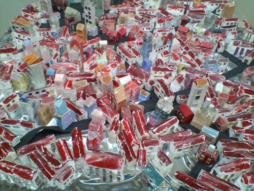 以前、福岡市の美術館で開催されていた「国際現代アート??」なんとかって時に会場に行った際に、一番印象に残った作品です。作者の女性の方が、色々と説明してくれました。木片を彩色して組み合わせて、色々な建物を作り上げて街並みを構成しています。また、街並みは積み木みたいに自由に配置を変えることができて、色々な街を作ることもできて、見てるだけで、楽しくなる作品でした。