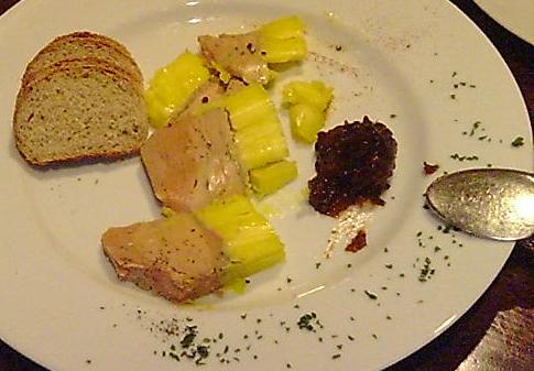 昨夜はいつも行く銀座の店へ今年最初の訪問をした。ここ最近青首の真鴨に出会えないでいるが久しぶりなのでちょっと多めに食べて飲んでしまった。出てきたのは1. フォアグラのテリーヌ2. 短角牛のタルタルステーキ3. 下仁田葱のロースト4. 松きのこと松なめたけのソテー5. 山鶉のロースト6. 苺のタルト飲んだのはN.Zのピノ・ノワール、シラー、あと1本は甘いベリーの香りと味がする赤の計3本。 飲みすぎた。驚いたのがフォアグラのテリーヌ。下の写真を見てください。(写りが悪いけど) 黄色のパイナップルのようなのがあるでしょ? それがフォアグラの脂なんだそうです。 しつこくなく口の中でとろっと溶けていく。 これだけ食べても美味さはないけど、フォアグラと一緒にパンに載せジャムをつけて食べると絶品の味になる。右の濃い赤色のジャムがまた絶品。ドライフルーツのイチジクと杏とベリーを煮てスパイスを加えたもの。家では絶対作れない味で、甘さの中から出てくるスパイスが絶妙でフォアグラにぴったり合う。家でフォアグラを食べる時につけるジャムや蜂蜜とは全くの別物。短角牛のタルタルや下仁田葱は相変わらずの旨さで、松きのこと松なめたけのソテーがシェリー酒が入っていて茸の味に甘さが加わって美味しかった。山鶉はジビエで美味しかったが、むね肉は鶏とそれほど変わらず、むしろモモにジビエらしい匂いを感じたが、個人的にはもっと臭くてもいいと思う。付け合せのトリュフのリゾットが美味しかったな。デザートは苺のタルト。 オプションで苺とアイスクリームを添えてもらいました。今年も1年ここで美味しい料理を食べていこう!!