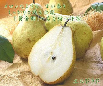 実は自分は洋梨中毒なのです。15-6年前まだラフランスが高かった頃(5-600円/個)、安いのを求め追熟を知らない八百屋の親父が汚れた(?)ラフランスを安売りしていたので1箱(10個位)800円で買った事がある。カゴメの「健康家族」という小売店には出ていない季節毎に出す旬の100%完熟ジュースでラフランスジュースを毎年2ケース頼んでいる。それ程好きな洋梨なのにこの「エルドラド」は知らなかった。うたい文句は「メロンのような甘く香り高く、ラフランスより糖度が高い。」販売が山形の果物を扱っている「清川屋 特産品 フルーツ王国」。ここでは昨年の初夏に砂丘アンデスメロンやさくらんぼを頼み、美味しかったので安心している。もともと山形は果物の産地として有名だ。サクランボだけでなく葡萄も美味しいし、洋梨も美味しい。 多分葡萄は山梨のより美味しいと思う。そんな山形の洋梨 エルドラド。 期待しています。