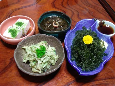 代表的な沖縄料理4品です。下右は 海ぶどう下左は ミミガー(豚耳)の和え物上左は ジーマミ(ピーナツ)豆腐上右は モズク酢です。どれも大変美味しく家族全員大好きなものです。