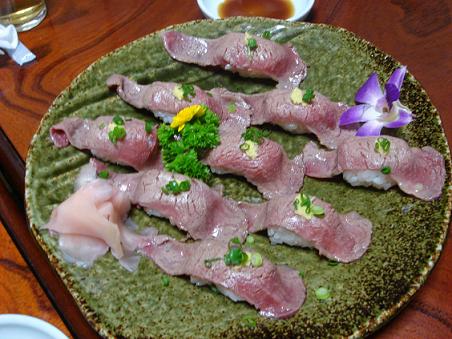 沖縄宮古島での料理の紹介が最後になりました。お肉の登場です。沖縄の牛肉といえば石垣牛が有名ですが、宮古島では宮古牛の料理が結構揃っています。ただ島内を回っても牛を見ることが出来なかったので、地元の人に聞くと島の中の畑の横などで飼育しているとのことでした。下の写真は宮古牛を炙ってから寿司にしたもですが、子供たちが全部食べて味はわかりません。その下の魚の開きの奥に見えるのは宮古牛の刺身ですが、これも子供とカミサンが食べて味はわかりませんでした。