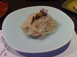 昨夜は久し振りに蕎麦屋で友人と語らいました。蕎麦屋といってもコンクリート打ちっ放しの建物で小林圭樹が携帯のCMで入った蕎麦屋さんです。10品のコースにそばの実が入っている焼き味噌、ニシンの姿煮、蛍烏賊の天麩羅を追加しました。この10品出てくるコースには初めと真ん中、最後と3回お蕎麦が出てきます。量は少なめですがさすが蕎麦屋のコースメニューですね。で、初めが「桜そば」。桜の蕾が載って出されてきます。蕎麦を手繰って何もつけずに口に入れると桜の香り(桜の葉っぱの香りだろうか? 桜餅や桜湯の香りがする。)が口に感じ、鼻から抜くとフワーッと強く甘く、塩ぱい香りを感じます。春ですね。汁をつけて食べると汁に桜が負けて香りを感じられなくなるので、そのまま食べた方が好きです。食べ終わる頃にポタージュぐらい濃い蕎麦湯が出てくるので汁はその蕎麦湯で楽しんだほうがいいみたいです。 真ん中に出てきた「十割蕎麦」。十割蕎麦と聞いてかなり濃い色の蕎麦が出てくるのかと思えば芯の部分を使っているのか予想より白い蕎麦が出てきました。汁は出てこず、手前の塩を箸につけてから蕎麦を手繰る食べ方です。残念なことに香りは弱めでしたね。挽きたて・打ちたてだともっと香りが楽しめたのになと思いました。 最後は温かい蕎麦で「浅利そば」です。春ということと、下町深川を意識してかの浅利です。浅利は別鍋で火を入れているので汁は普通のやや甘めの蕎麦つゆです。美味しい蕎麦でした。 お酒はビール、九平次、飛露喜を飲み、楽しい一時でした。今度はカミサンと行こう。