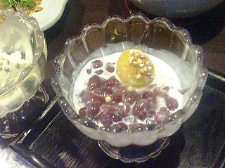 一昨日の蕎麦屋のデザートです。コースのメニューにはアイスクリームとぜんざいが選べると書いてあります。「へえ、ぜんざいか、 なにぜんざいかな?」メニューをよく見ると「あわぜんざい」と書いてある。「あわぜんざいは、神田の竹村で食べたのが美味しかったな。 久しぶりに食べてみよう。」と心に決めました。料理も最後になり、お店の人から「デザートはアイスとぜんざいがありますがどちらにいたしますか?」と聞かれたので当然「ぜんざい」と答えました。やがて運ばれてきたのが下の写真のぜんざいです。 どうみても「あわぜんざい」じゃない。もう一度メニューをみると「粟」ではなく「栗」と書いてあった。老眼が始まっている我が眼には「粟」と「栗」の違いが識別できなかったのだ。でもとても美味しい栗ぜんざいでした。