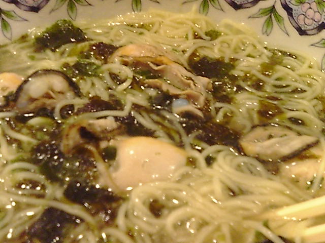 雲呑麺の美味しいラーメン店にいき、何気なくメニューをみると「冬の牡蠣ラーメン」の文字と写真が飛び込んできた。A4サイズはあろうかという大きな写真にはぷっくらと膨らんだ牡蠣がのっている。お蕎麦の牡蠣蕎麦は知っているがラーメンでは初めてだ。思わず「牡蠣ラーメンください。」と頼んでしまった。出てきたラーメンは以下の写真の通り大粒の牡蠣が5個入っている。具は牡蠣と若布と生海苔。その海苔のせいでスープは緑がかっているが基本は塩味。ラーメンのスープを鍋に移しそこに牡蠣、若布、海苔を加えている。塩味の中に牡蠣の味が加わり美味しく仕上がっている。胡椒はこのラーメンには相性が悪い。かんずりなんかが合うんじゃなかろうか・・・。柚子の香りも合うかもしれない。味噌味にしてしまうと土手鍋風になるので、この塩味は正解だと思う。日本蕎麦は季節に応じた蕎麦をだしているがラーメンはあまり見かけない。せいぜい冷やし中華ぐらいだろう。もっと季節を盛り込んだラーメンを出しても良さそうなもんだ。例えば春でいえば浅利のラーメンとか、筍の天ぷらや山菜の天ぷらとか・・・。