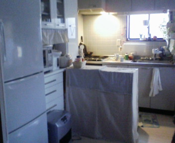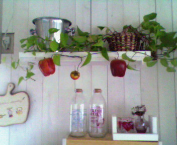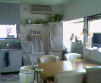 とりあえず、落ち着きました~~ジャ~~~ジャ~~とミシンをかけ、適当に作りまして・・・・物が置いてあるところは隠してしましました二番目の写真の白い棚、私が作ったのですが、便利なんですよ~~~料理中に鍋や色々乗せられるんです。(でもヘタッピで笑いがでます)かなり、重宝してます。三番目の出窓にカフェカーテンをしました。見て分かるとおり、うち、テーブルにもテレビあるんですよ・・・主人が野球をどうしても見たい人なので・・・巨人の応援で・・・娘は阪神だし・・・二つ同時の時は最悪私の見たいの見れないようまぁ・・・夏だけだから・・・ようやくゆっくりできます。カーテンやその他諸々はゆっくりやります