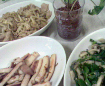 あやつの居ぬ間にお刺身を・・・と思い、スーパーへ・・・あら~~~今日に限ってお刺身盛り合わせの大安売りお刺身の前にはすごい人だかり・・・・少し待つか・・・と思いきや・・・・始まった~~~チビのグズリ・・・ギャ~~~だの、ウ~~だの、ピィ~~~だの・・・しょうがないので手前にあったアジの刺身だけゲット・・・いつも一品しか載せないのですが今日は全部載せよう。昨日のご飯です。手前から、ニラとシメジの酢、和からし醤油和え、イカの昆布醤油漬け焼き、豚バラとエノキのニンニク醤油炒め・・・・唯一ゲットのアジの刺身、山芋のおかか醤油和え・・・照り焼きチキンサラダ・・・エノキと豚バラ炒めが一番おいしかったです。今日は主人の会社でアルバイト・・・(義母の予定はかなり狂う。毎週金なのに)その後はマッサージに行きます。そしてそして、夜はみんなでご飯みたいです。ウナギかお寿司か、どちらかみたいですが、私は寿司がいいなあしかし、主人はうなぎがいいと言ってましたので、ウナギだろうな・・・今日は涼しくて気持ちいい!!