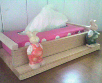 毎日毎日工作していると、さすがに嫌気が・・・しかし余り木を見捨てることはできなかったですティッシュ入れを作りました。ウサギさんたちをボンドで付けて・・・あ~~これで終わり!!そういえば、以前載せたクッキーが超簡単なのでレシピ載せます。すっごくおいしいかといえば、・・・・そこそこおいしいです。でも急な来客や、バターが無いわって時でも作れます。薄力粉・・・・・・・・・・75g抹茶(またはココア)5gサラダ油・・・・・・・・・30g砂糖・・・・・・・・・・・・30~50gお好みで牛乳・・・・・・・・・・・・30g1・・ボウルにサラダ油、砂糖、牛乳を入れてまぜまぜ・・・2・・粉類を入れてヘラで混ぜます。絞り袋に入れ絞ります。3・・170度のオーブンで15~20分焼きます。このレシピ、ミルクティーとか、紫芋パウダーとか黒糖きなこバージョンとかあるんですよ。台風怖いな・・・大事にしてるミニトマトの鉢、倒れてしまった。グスン・・・・大丈夫かな、私の植木ちゃん・・・