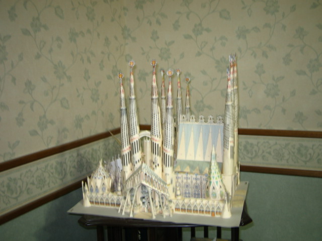 やっと半分くらいできてきました塔は12本までできました実物の塔はまだ8本しかできていないから、少しリードしたかな完成時の塔の数は18本で、真ん中の十字架の付く一番高い塔は170メートルになるらしいよ今の大きさでも十分にびっくりするけれどねまだ、完成まで100年くらいかかるのだろうねそのくらいこの建物は細かいのだよ
