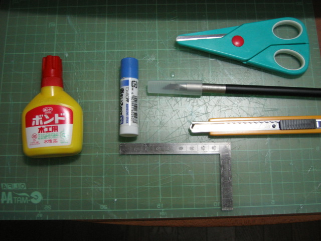 今日は、いつもペーパークラフトを作るのに使う道具を紹介しますねまず、下にひいている下敷きみたいなのがカッティングシートですA4判のオルファ製。下を傷つけないように使います。左から木工用ボンドとスティック糊。強力に付けたい時は木工用ボンド、少しの接着にはスティック糊と使い分けます。カッターは2種類で、大まかに切る刃の大きいのと、細かく切る精密工作用カッター。精密用カッターはカーブのあるものと細かい細工に使います。最後に定規直角定規は実は会社のレーザー加工機を使い自分で作りましたよレーザー加工機で結構いろんな物作ってますよレーザーの出力を変えると、メモリを焼き後で入れれるし、10センチくらいの厚い鉄板まで切れるんだ直角定規は紙を切り過ぎるのを防ぐこともできるし、ステンレス製だからカッターの刃にも傷つかなくて調子がいいのだCADソフトを使って設計したよ