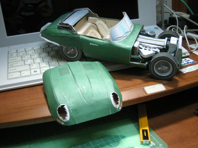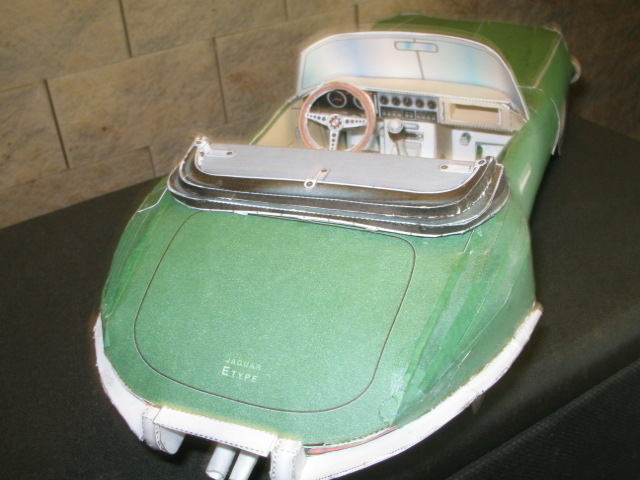 某HPからダウンロードした、ジャガーEタイプです。もう、50年も前の車なんだね。でも、かっこいいでしょう。エンジンルームや、マフラーまで忠実に再現されているのがなかなか通好み写真だと紙で作ってあるのが分かりにくいでしょう。ボンネットのアールとボディーのアールを合わせるのに少し苦労しました。このあたりの難しさがプラモデルとペーパークラフトとの差かな。でも、無料ダウンロードだから、紙代と糊代くらいしかかかってないのが嬉しいところだね