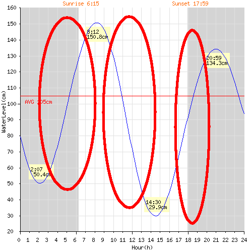 「潮が動く」ってのは、やっぱりこの赤丸の時間帯なんでしょうね?で、この時間なら常に動いているんでしょうか???で太平洋と日本海ではこんなに違うし・・・。グラフのイメージだと、太平洋は「ザー、ピタッ、ザザー!!」ッテ感じで、日本海は「サラサラ、びよーーーん、サラサラサラー」って感じに見える(意味不明?)ちなみに9日のグラフです。中潮ね。頂点以外でも、潮が流れていなかったりすることもあるのかな?