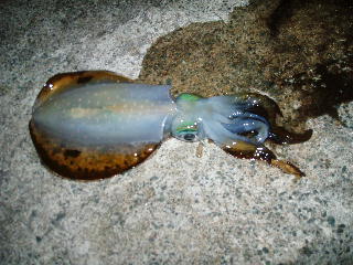 こんにちは、たこおやじです4日の深夜出発、小浜の漁港へ行ってきました今回は、先日、釣りの世界へ迷い込んだ(引きずり込んだ?)友人I君との釣行ですが、なんと、その奥さんも一緒に行くという・・・・・う~ん、ウチの嫁さんとはエライ違いだで、今回は友人の車に乗せてもらっていざ出発・・・・でも雨降ってきたよ~朽木通過中に、よく一緒に行くS君からメール「2ハイ、雷きついので休憩」え?また先を越されたよ到着・・・・・・・雷雨です・・・・・・・仕方ないので車中で休憩しかも、I君の苦さん、半ば強引に連れてこられたようだまあ、アウトドア派だからナントカ・・・・・・・豪雨ですから・・・・一応、オキアミも買ってきてあるし、アジくらいはお持ち帰りできるでしょうそれにしても、雨やまないよなあ 夜中の2時くらいに小雨になり、決行しかし、今からやると、睡眠とれない、徹夜ですか?僕の一番嫌いなパターンだよで、当たりはもちろんなし寝ないまま、朝まで休みながらしゃくるも全く・・・・・・・おまけに、雨がやむと次はとんでもない暴風静かだった海が瞬く間に白波が立つそんなお日様が昇ったとき、沖目でフッ、ビッシッやっとこさの1杯目、続けて2ハイでもサイズが15センチくらい、納得いかないまましばし当たりも遠のき午前8時前、ククンこれはいい感じ、あがってきたのはたぶん17センチくらい(エギは3号)、納得ですでも、横にたばこの吸い殻が・・・・・・皆さん、海をきれいに・・・・・・その後、1回あった当たりを取り損ね、終了です全て、沖目の底でしたそうそう、Iくんは、エギングしながら、奥さんの釣ったアジに、木っ端グレをはずしていたのですが、迷わずアイゴにも手を伸ばし、しっかり刺されていました知らない魚にはさわらないでっていってたのに、まあ、次からはもっと用心するでしょうで、アジもあまり釣れなかったんですよねお日様が昇ってからはわかるのですが、夜中もあまり釣れない・・・・・これってなんかヘン?ナントカ3ハイ釣って面目も立ち、釣ったイカは、I君の晩ご飯に進呈しましたホントは、もっと釣ってハナターカダカといきたかったのですが、僕の腕ではこれでやっとです帰りに、魚屋さんをのぞいてみると、水槽に20センチ弱がウヨウヨ隣の水槽にも同じように、でもこっちは白い・・・と思ってのぞき込んだら、急に真っ黒に・・・・興奮したのか、I君が手をかざすと、それだけで墨を吐く始末ホントは網に入ったものかとかききたかったんですが、水槽真っ黒にしたので、逃げるように退散お魚屋さん、ごめんなさい水槽が浅いものだったからかもしれないが、中からしっかり、人間が見えているようですと、いうことは、エギを泳がせて烏賊がついてきても、水面近くにまで浮かせてしまったら、のぞき込んでる僕の姿も見えている・・・・・・烏賊君、エギに興味あっても警戒する・・・・・・・抱かないなんてこともあるのかなあ