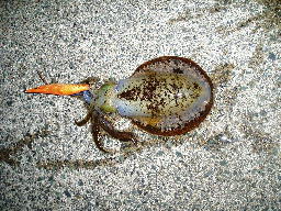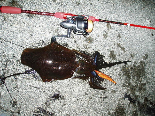 こんばんわ、たこおやじです今日も行ってきましたこれとあと一杯、小さいです二つだけです撃沈です、だから結果から書きました おとつい、友人からメールが・・・・・***で、つれた、@@@は、ちっこいのがいっぱい即乗っちゃいました場所は、今期とても不調で有名な某半島の漁港月は満月に近く大潮、期待もふくらみ、早く目が覚めて4時に現地入り本とは前夜入りしたかったが、嫁さん夜勤日が上がるまでの2時間勝負に来たわけですでも・・・・・大潮の割に潮が動いていない満月で、風はほぼ無風、ほかに釣り人なし絶好のコンディションのはずなのに、潮がなんかトローリというか、まったりとしたかんじあたりもなく1時間半経過そんなときに足下で乗ったのがこれでしたあとは、シーン3時間後北へ移動ここは結構人がいたでも、イカ居ない、2時間で移動南へ下がり半島根元・・・・小場所で、人がいて釣り場なし大好きなテトラポイントへ小さいのが1はい 完敗です でもこれだけじゃないんです 途中で、なんか変???あれっ?ライン切れた?とおもったら、ものすごい糸ふけで、餌木の重みが感じない少したって思い出しました確か去年もあったぞ、リールの逆回転 実はここのところ、シーズンも終盤と言うことで、メインリールのセフィアは新しいラインを巻いて、待機に回したのですで、今はダイ○のカルディ○KI○そう、逆回転で一世を風靡したやつ去年、僕も例に漏れずに無償修理を受けたのです完璧に直ると思ってたのに、再発するのね~ またまた入院です 次から、さらに古い、旧型カルディアの登場です うーん、KI○はエギングには向いていないのかなあ? といって、セフィアもう1台買う金もないし え~ん、せめて5~6はい釣りたいよ~もうお日様が昇ってます、トーゼン