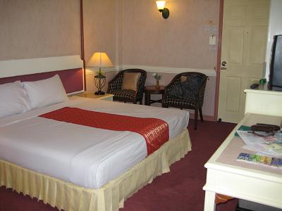 機内ではシンガポール航空のお姉さま方に機内食やジュースを頂き寛いでました^^;1年ぶりに見ましたがいやほんとヤヴァ~い…チャンギにはこのシンガポール航空の制服を売ってるので買っちゃおうかな…ってのは冗談で到着しました…バンコクの新空港に去年タイ旅行に来たお友達2人(女性)が「すっごいよかったですよ~」っていうものでどうしても行ってみたくなりまして実はスーツケースを最終目的地まで送れなかったので、手元にはスーツケース+大きい鞄…どうも丸1日以上は空港がセキュリティの関係上預かれなくなったみたいです…7年ぐらい前のルフトハンザ航空では1日以上でも最後まで送ってくれたんですけどね~タイでは入国の際に入国カードを書かないといけないのですが、飛び込みor野宿って考えてたのでホテル欄に何も記入できない…案の定審査官に聞かれて、航空券を見せろって言われたので見せると特殊な旅程すぎて余計怪しまれました(泣)他の方は2,3分のところ8分ぐらい質問されたり、旅程チェックされたりしてました…それにしても英語の勉強サボりすぎてて何にも分からな~いヽ(´д`;)ノピンチ通じてるか知りませんが、「すぐホテル予約するから」とか言ってようやく入国スタンプを貰えました…空港を出るまでに怪しそうじゃない空港公式のホテル手配所があったのでそこで探して貰いました。英語が出来るお姉さんに場所だけ指定して、最初に提示されたホテルは3800バーツ(13300円)…「そんなに金あるかゴルァ」って言いかけたのを飲み込んで(笑)せめて1500バーツでな~い~?って聞いてみると、ここのダブルが1300ちょいですって。お~写真ではいいお部屋過ぎる…けど空港でこれ以上安いホテルを頼むのも悪いしここでいっか~パパッとホテルに電話してくれて予約完了~♪お金はここで先払いらしいのでcradを渡したのですが、さっきまで英語で話してたのにcardだけが通じないんです…ってかタイにいる間中ずっとcardっていう発音は通じませんでした…何故だ??けどこのお姉さん、親切にいろいろ教えてくれました♪「タクシーは乗る前にお金の交渉しなさいとか、呼び込みしてるナイトスポットやタクシーは駄目ですよ」とかetc...なるほどタクシーで料金稼ぎのためにグルグル回られたら嫌ですもんね~この新空港からバンコク中心部までは300バーツ(1050円)払えば快く行ってくれるらしい…まぁ痛いけどタクシーでその値段ならなんとか…スーツケースを引きずってタクシー乗り場に行き、300バーツでホテルまでお願いしましたm(_ _)mこの運転手さんは新しく出来た空港が誇らしいらしくgoodでしょ~って笑ってましたでもね~この渋滞の酷さは…朝夕の渋滞は酷いって『地球の歩き方』に書いてましたけどここまでとは…進まない&運転手さんがホテルを知らなくて迷う迷うで2時間かかりました…○| ̄|_それでも事前に交渉してたので300バーツなんですが^^;クーラーの効いたタクシーから降りると、眼鏡がサーッと曇りましたそこでフッと気づいたのですが、この気候プールと全く同じだ気温32度、湿度75%って普段いたプールと全く同じなんです(笑)そういえば、飛行機から降りたとき日本人が「蒸し暑っ」って言ってたっけ~自分は高い湿度に慣れてるから何とも思わなかったけど、普通の方には70%超える湿度は辛いかな~^^;奥まったところにありましたが、ホテルに入るとやはり綺麗…しかも部屋広っ、ダブルだし…まぁこれが手数料入れて1400バーツならいいか~♪そして、お友達(女性2人)から聞いていた地球の歩き方に出てるような健全な?ナイトスポットに繰り出しました(爆)地図を見ながら歩いたのですが、歩いたのですが思ってたよりも遠そう…タクシーはボられるし…と思いながら歩いているといいもの発見~~ヽ(´―`)ノオートバイクタクシー☆ここまで行ってって見せると40バーツ(140円)♪お願いしま~すってことで、ノーヘル2ケツでバンコクの街を疾走~(爆)これの動画を撮影したら面白そう~~♪ってことでカメラを取り出そうとしたら、段差を超えるとき落ちかけました…○| ̄|_本気でヤヴァかったほんまちゃんと舗装して……なので大人しく赤信号で止まってるときにパチリ^^;そしてナイトスポット到着~♪入場料ナシでご飯を注文するとタイプと、入場に700バーツ必要な2軒はしごしました(*/ω\*)で1軒目でせっかくなんでトムヤムクン(120バーツ)を注文したのですが…かっらい、これは辛い…5倍カレーまでなら普通に食べられる自分でも無理…しかも入ってる野菜にストローみたいな食感のがある…残しました…20代になって初めてご飯を残しました…○| ̄|_悔しいしごめんなさいm(_ _)mその後、2時になると法律で規制されてて閉まるらしくホテルに帰りました。3回目のオートバイタクシーでホテルに帰ったのですが、渋滞もなくなり制限80kmの道路で自動車を抜いてました(笑)ヒャッホ~ウって感じですヽ(´―`)ノ落ち着いて、地球の歩き方をよく読むと10行ほど載ってました(笑)これはモーターサイっでいうタ