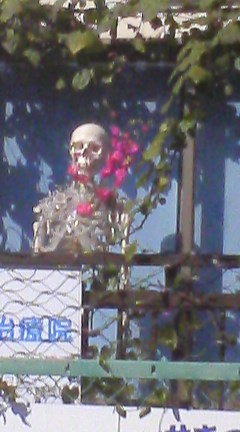 たくみんを連れて、毎日買い物に通るアパートの南側テラス。見えますか?たくみんが見つけましたこの画像は、節分の前のものです。「骸骨」が「鬼のお面」をつけてテラスに立っています。節分が終わると…「梅の花」をあしらえて、今日もみごとに立っていらっしゃいましたちょっと見づらいのはごめんなさい。ちなみにこちらの「お方」、整骨院の看板娘らしい…。カメラマン お題 ともに たくみん♪です