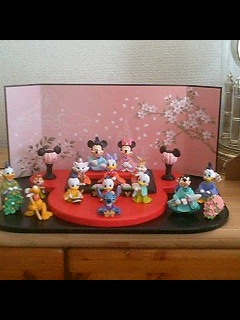 先日、ブログ友だちのmystery大好きさん(昨日も登場しましたが…)のブログにも書かれていた「雛人形」のお話。ディズニーリゾートで、かわいい雛人形があるというお話でした。雑誌に載っていたので、実物がどんなものなのか、値段が9,800円であること、買おうかどうしようか…という内容のものでした。たくみんになら、値段も手ごろだしちょうどいいかも…と思ってはいたものの、先日、TDLに行ったときにショップを見て…見つけました。見方にもよりますが、たくママ的には実物を見て即決でした。キャラクター一つずつも、意外としっかりしていてずっしりと重みもあり、小さいお人形独特の「いい加減な塗装」もありません。大きさは、横幅が40センチほど、縦幅26センチ、高さは17センチほどでした。木製の台はミッキーの顔の形で、重厚でがっしりしています。一つ難点を言うと、透明のケースが付属されていなかったことですね。バタバタ走り回るわが家の娘、埃をまき散らして日々を過ごします。埃対策が万全じゃないとお雛さまがかわいそうですね…100円ショップや、ホームセンター、挙げ句ネットでいろいろと探してみましたが、大きさの合うものがなく、埃をかぶらないように毎日掃除を欠かさず守ってやろうと思いました。小学校を卒業するくらいまで、これで十分なような(褒めすぎ)気がしますしばらくはクリスマスに次いで、居間が賑やかになりますショップでたくママが手に取り、吟味しているそばから3個あった在庫はみるみる無くなってしまいました。さすが、連休最終日でした