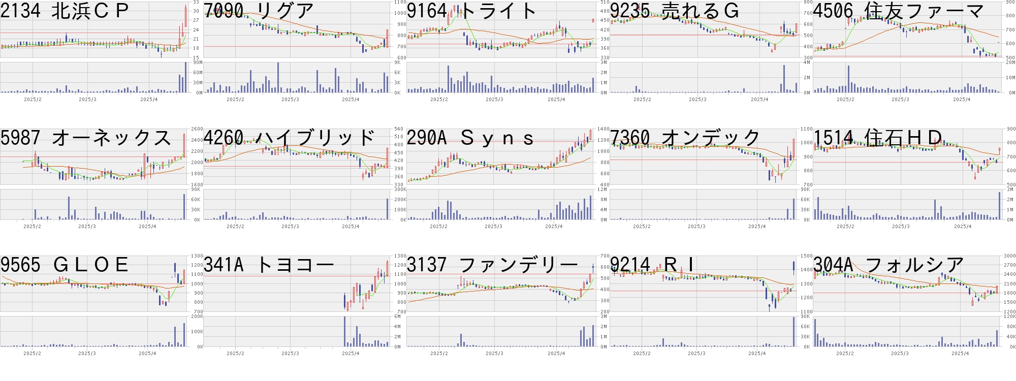 コード,銘柄名,市場,株価,前日比,前日比.1,出来高,PER,PBR,利回り2134,北浜CP,東S,31,8,+34.78%,89916600,172,4.61,-7090,リグア,東G,850,150,+21.43%,4700,-,2.62,-9164,トライト,東G,454,80,+21.39%,1401900,12.3,1.63,2.649235,売れるG,東G,603,100,+19.88%,1234200,-,8.81,-4506,住友ファーマ,東P,608,100,+19.69%,417900,15.1,1.45,-5987,オーネックス,東S,2500,400,+19.05%,75000,14.2,0.79,0.804260,ハイブリッド,東G,467,69,+17.34%,202300,40.3,2.36,-290A,Syns,東G,1370,202,+17.29%,9393700,-,7.86,-7360,オンデック,東G,1027,150,+17.10%,61500,17.9,2.45,-1514,住石HD,東S,760,100,+15.15%,2680300,11.3,1.86,3.959565,GLOE,東G,1145,150,+15.08%,152400,-,6.76,-341A,トヨコー,東G,1230,152,+14.10%,827300,99.5,12.27,-3137,ファンデリー,東G,599,67,+12.59%,2062800,199,13.61,-9214,RI,東G,1400,154,+12.36%,85900,14.1,2.72,-304A,フォルシア,東G,2011,221,+12.35%,62300,14.5,1.28,-コード,銘柄名,市場,株価,前日比,前日比.1,出来高,PER,PBR,利回り7863,平賀,東S,1058,-243,-18.68%,116100,7.6,0.73,3.783370,フジタコーポ,東S,285,-62,-17.87%,927800,9.3,5.37,-6029,アトラG,東S,147,-27,-15.52%,1672300,58.1,1.05,-8143,ラピーヌ,東S,243,-44,-15.33%,1019100,-,0.69,-4679,田谷,東S,259,-43,-14.24%,958600,13.0,3.59,-9610,ウィルソンW,東S,85,-14,-14.14%,1910500,-,0.92,-6276,シリウスV,東S,275,-41,-12.97%,435200,63.8,0.52,3.642721,JHD,東S,199,-28,-12.33%,813700,-,-,-3985,テモナ,東S,188,-26,-12.15%,728500,62.7,2.92,-2493,イーサポート,東S,1015,-132,-11.51%,136900,36.8,1.27,0.491711,SDSHD,東S,232,-30,-11.45%,1147000,-,3.85,-3111,オーミケンシ,東S,296,-37,-11.11%,924300,4.1,3.18,-7044,ピアラ,東S,246,-30,-10.87%,368100,10.8,4.01,-4240,クラスター,東G,220,-25,-10.20%,795800,20.2,0.79,-4179,ジーネクスト,東G,296,-33,-10.03%,728500,-,11.67,-にほんブログ村