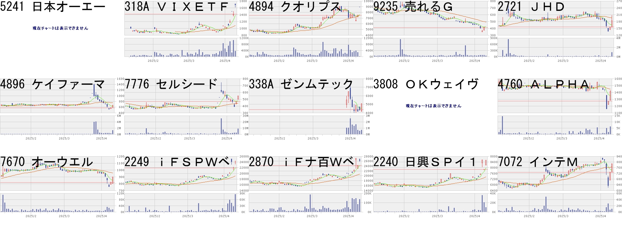 コード,銘柄名,市場,株価,前日比,前日比.1,出来高,PER,PBR,利回り5241,日本オーエー,名N,1335.0,300.0,+28.99%,51100,16.5,1.57,-318A,VIXETF,東E,1700.0,290.0,+20.57%,351010,-,-,-4894,クオリプス,東G,8950.0,1500.0,+20.13%,16300,-,13.34,-9235,売れるG,東G,493.0,80.0,+19.37%,39300,-,7.20,-2721,JHD,東S,184.0,28.0,+17.95%,868200,-,-,-4896,ケイファーマ,東G,664.0,100.0,+17.73%,1221600,-,3.41,-7776,セルシード,東G,547.0,80.0,+17.13%,8663100,-,8.81,-338A,ゼンムテック,東G,5080.0,705.0,+16.11%,697600,41.9,28.75,-3808,OKウェイヴ,名N,53.0,6.0,+12.77%,774300,-,26.63,-4760,ALPHA,東S,1410.0,139.0,+10.94%,6200,6.1,0.83,3.557670,オーウエル,東S,896.0,80.0,+9.80%,15000,6.4,0.43,3.912249,iFSPWベ,東E,24005.0,2060.0,+9.39%,84468,-,-,-2870,iFナ百Wベ,東E,26440.0,2255.0,+9.32%,135654,-,-,-2240,日興SPイ1,東E,8530.0,652.0,+8.28%,9530,-,-,-7072,インテM,東G,786.0,58.0,+7.97%,9700,31.2,1.61,-コード,銘柄名,市場,株価,前日比,前日比.1,出来高,PER,PBR,利回り5842,インテグラル,東G,2272.0,-397.0,-14.87%,317800,-,1.33,1.506469,放電精密,東S,1151.0,-194.0,-14.42%,274000,31.0,1.67,1.305243,ノート,東G,1569.0,-245.0,-13.51%,2811000,235,11.50,-2038,原油先Wブル,東EN,1249.0,-172.0,-12.10%,1359904,-,-,-9344,アクシスC,東G,730.0,-100.0,-12.05%,82000,5.8,1.15,4.799425,ReYuu,東S,477.0,-64.0,-11.83%,412900,-,3.03,-1684,WT商品総合,東E,1570.5,-207.5,-11.67%,300,-,-,-5247,BTM,東G,721.0,-95.0,-11.64%,225600,42.3,3.05,-2652,まんだらけ,東S,276.0,-36.0,-11.54%,2289900,6.0,0.81,0.363628,データHR,東G,375.0,-46.0,-10.93%,73700,-,1.87,-5817,JMACS,東S,387.0,-45.0,-10.42%,13000,21.6,0.42,2.587422,東邦レマック,東S,347.0,-40.0,-10.34%,22000,13.6,0.38,3.294419,フィナHD,東G,690.0,-78.0,-10.16%,688100,62.0,4.07,-7256,河西工,東S,80.0,-9.0,-10.11%,634900,-,0.18,-4970,東洋合成,東S,4225.0,-470.0,-10.01%,70400,13.4,1.42,0.95にほんブログ村