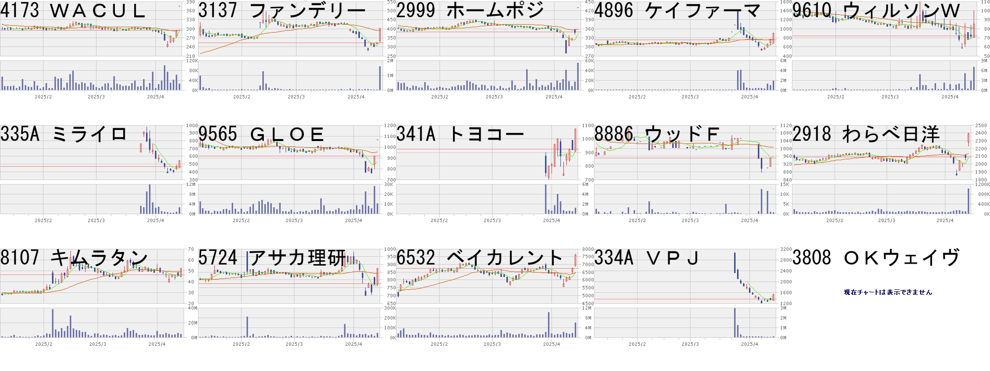 コード,銘柄名,市場,株価,前日比,前日比.1,出来高,PER,PBR,利回り4584,キッズバイオ,東G,162,50,+44.64%,8135800,-,7.18,-149A,シンカ,東G,1318,212,+19.17%,493100,174,4.28,-2334,イオレ,東G,1041,150,+16.84%,29400,-,10.71,-9704,アゴーラHG,東S,95,13,+15.85%,25271200,68.8,6.51,-9603,HIS,東P,1635,207,+14.50%,5041800,15.9,2.18,1.228918,ランド,東S,8,1,+14.29%,72564300,14.0,1.4,-6846,中央製,名M,1365,165,+13.75%,2900,5.6,0.48,3.083936,GW,東G,116,14,+13.73%,4734000,-,6.3,-3409,北日紡,東S,178,18,+11.25%,409400,-,4.6,-3288,オープンH,東P,6197,626,+11.24%,1540200,7.2,1.47,2.876707,サンケン,東P,7452,723,+10.74%,744200,3.8,1.13,-3341,日本調剤,東P,1646,156,+10.47%,758100,24.6,0.85,1.526025,日本PC,名N,738,68,+10.15%,700,10.7,5.03,-3739,コムシード,名N,200,18,+9.89%,345700,-,4.04,-7782,シンシア,東S,584,50,+9.36%,259100,24.1,1.39,1.71コード,銘柄名,市場,株価,前日比,前日比.1,出来高,PER,PBR,利回り5721,Sサイエンス,東S,88,-28,-24.14%,40787600,-,4.24,-4882,ペルセウス,東G,586,-150,-20.38%,99100,-,5.54,-192A,インテG,東G,2925,-700,-19.31%,148700,7.1,3.28,-336A,ダイナマップ,東G,1192,-273,-18.63%,3073100,-,8.67,-335A,ミライロ,東G,580,-99,-14.58%,2329000,58.4,17.26,-5597,ブルーイノベ,東G,990,-168,-14.51%,390300,-,6.16,-4894,クオリプス,東G,7140,-1170,-14.08%,743200,-,10.64,-3726,フォーシーズ,東S,721,-116,-13.86%,185000,1030,6.24,-338A,ゼンムテック,東G,5700,-800,-12.31%,2509200,47.1,32.25,-6181,タメニー,東G,132,-17,-11.41%,1968000,-,138.0,-3607,クラウディア,東S,311,-38,-10.89%,169300,8.0,0.68,3.223182,オイシックス,東P,1199,-143,-10.66%,1053400,13.0,1.38,-4685,菱友システム,東S,6500,-760,-10.47%,77400,12.9,2.29,2.46334A,VPJ,東G,1611,-188,-10.45%,77200,20.5,3.41,0.986967,新光電工,東P,6605,-756,-10.27%,767600,49.6,3.2,-にほんブログ村