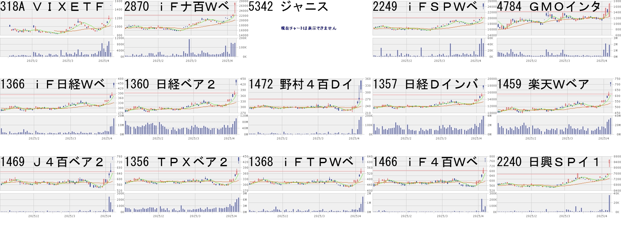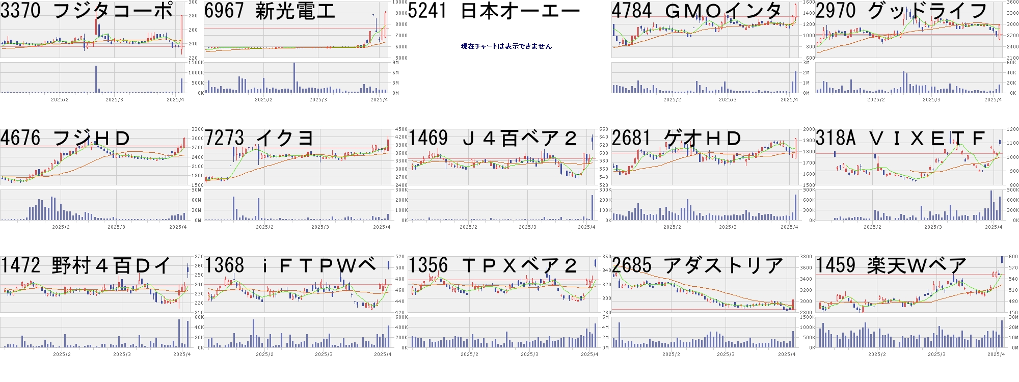 コード,銘柄名,市場,株価,前日比,前日比.1,出来高,PER,PBR,利回り318A,VIXETF,東E,1497.5,300.0,+25.05%,255890,-,-,-2870,iFナ百Wベ,東E,27160.0,5000.0,+22.56%,143537,-,-,-5342,ジャニス,名M,465.0,80.0,+20.78%,17100,43.0,1.80,-2249,iFSPWベ,東E,24235.0,4150.0,+20.66%,42973,-,-,-4784,GMOインタ,東P,1687.0,258.0,+18.05%,1899300,92.5,89.31,1.081366,iF日経Wベ,東E,443.0,62.0,+16.27%,16947532,-,-,-1360,日経ベア2,東E,433.0,59.4,+15.90%,100884730,-,-,-1472,野村4百Dイ,東E,314.0,43.0,+15.87%,183405,-,-,-1357,日経Dインバ,東E,17620.0,2410.0,+15.84%,3882150,-,-,-1459,楽天Wベア,東E,711.0,96.0,+15.61%,34190522,-,-,-1469,J4百ベア2,東E,751.6,100.0,+15.35%,39400,-,-,-1356,TPXベア2,東E,428.7,57.0,+15.33%,6792380,-,-,-1368,iFTPWベ,東E,616.0,81.0,+15.14%,1632472,-,-,-1466,iF4百Wベ,東E,783.0,100.0,+14.64%,85559,-,-,-2240,日興SPイ1,東E,8545.0,1000.0,+13.25%,35480,-,-,-コード,銘柄名,市場,株価,前日比,前日比.1,出来高,PER,PBR,利回り5241,日本オーエー,名N,1011.0,-300.0,-22.88%,84800,12.5,1.19,-6264,マルマエ,東P,899.0,-251.0,-21.83%,634700,10.7,1.50,3.344056,ニューラルG,東G,550.0,-150.0,-21.43%,95800,211,14.23,-7847,グラファイト,東S,563.0,-150.0,-21.04%,259300,9.7,0.73,5.333350,メタプラ,東S,303.0,-77.0,-20.26%,36353300,-,7.20,-6506,安川電,東P,2668.0,-676.0,-20.22%,6221100,14.9,1.60,2.552467,バルクHD,名N,115.0,-29.0,-20.14%,123800,1.5,3.90,-2869,iFナ百Wブ,東E,27850.0,-7000.0,-20.09%,33061,-,-,-2934,ジェイフロ,東G,1440.0,-356.0,-19.82%,46600,-,6.49,-4760,ALPHA,東S,1163.0,-282.0,-19.52%,4900,5.1,0.69,4.30280A,TMH,東G,1068.0,-258.0,-19.46%,38900,18.2,5.05,-285A,キオクシア,東P,1518.0,-365.0,-19.38%,11235000,3.1,1.14,-9212,GEI,東G,317.0,-76.0,-19.34%,112000,396,1.93,-3779,Jエスコム,東S,117.0,-28.0,-19.31%,246900,-,1.72,-9417,スマバ,東S,306.0,-73.0,-19.26%,108000,1055,2.21,1.96にほんブログ村