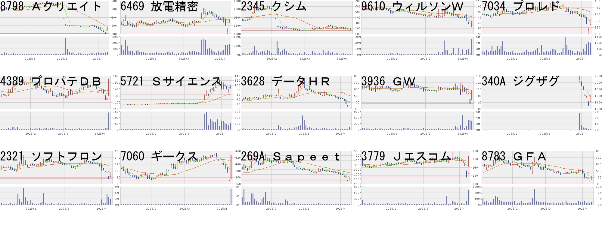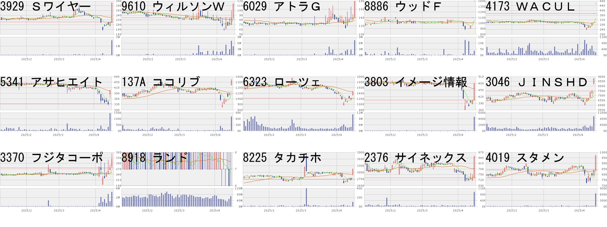 コード,銘柄名,市場,株価,前日比,前日比.1,出来高,PER,PBR,利回り4288,アズジェント,東S,1336,600,+81.52%,384800,-,8.94,-4240,クラスター,東G,307,80,+35.24%,478000,17.5,1.1,1.309377,AGP,東S,1413,300,+26.95%,4400,25.4,2.04,3.186201,豊田織,東P,16225,3000,+22.68%,178300,20.4,1.0,1.734176,ココナラ,東G,453,72,+18.90%,26911700,82.1,4.69,-2480,シスロケ,東S,1748,270,+18.27%,122600,15.7,1.68,2.17338A,ゼンムテック,東G,10160,1500,+17.32%,342600,86.6,59.38,-9235,売れるG,東G,1036,150,+16.93%,53800,-,15.25,-7014,名村造,東S,2055,291,+16.50%,10734100,6.5,1.41,1.706614,シキノHT,東S,1073,150,+16.25%,153600,-,1.93,1.405482,愛知鋼,東P,8870,1230,+16.10%,811000,17.8,0.73,5.211777,川崎設備,名M,1090,150,+15.96%,27200,5.9,0.98,4.59218A,リベラウェア,東G,1045,134,+14.71%,3842300,394,32.03,-6016,ジャパンエン,東S,3440,441,+14.70%,448200,6.9,2.18,2.096626,SEMTEC,東S,1825,232,+14.56%,168500,6.2,0.83,2.19コード,銘柄名,市場,株価,前日比,前日比.1,出来高,PER,PBR,利回り260A,オルツ,東G,337,-80,-19.18%,99700,-,3.05,-6836,ぷらっと,東S,965,-181,-15.79%,2106300,305,11.87,-8918,ランド,東S,7,-1,-12.50%,53464800,15.2,1.21,-3778,さくらネット,東P,3355,-410,-10.89%,7071300,55.9,4.47,0.15353A,エレコミ,札A,2040,-242,-10.60%,44200,16.2,9.27,-3137,ファンデリー,東G,592,-69,-10.44%,317100,197,13.45,-278A,テラドローン,東G,6630,-740,-10.04%,583900,-,9.18,-7050,Fインタ,東G,1928,-201,-9.44%,102900,10.3,1.0,4.885659,日精線,東P,1090,-110,-9.17%,332600,14.5,0.81,3.857976,菱鉛筆,東P,2262,-228,-9.16%,657600,13.0,0.98,2.127822,永大産業,東S,225,-22,-8.91%,1692100,-,0.23,4.443636,三菱総研,東P,4495,-415,-8.45%,158100,17.3,0.99,3.565857,AREHD,東P,1759,-151,-7.91%,1577100,8.3,1.07,4.555870,ナルネット,東G,591,-50,-7.80%,493600,15.3,0.97,2.545906,エムケー精工,東S,452,-38,-7.76%,741100,9.5,0.4,2.21にほんブログ村