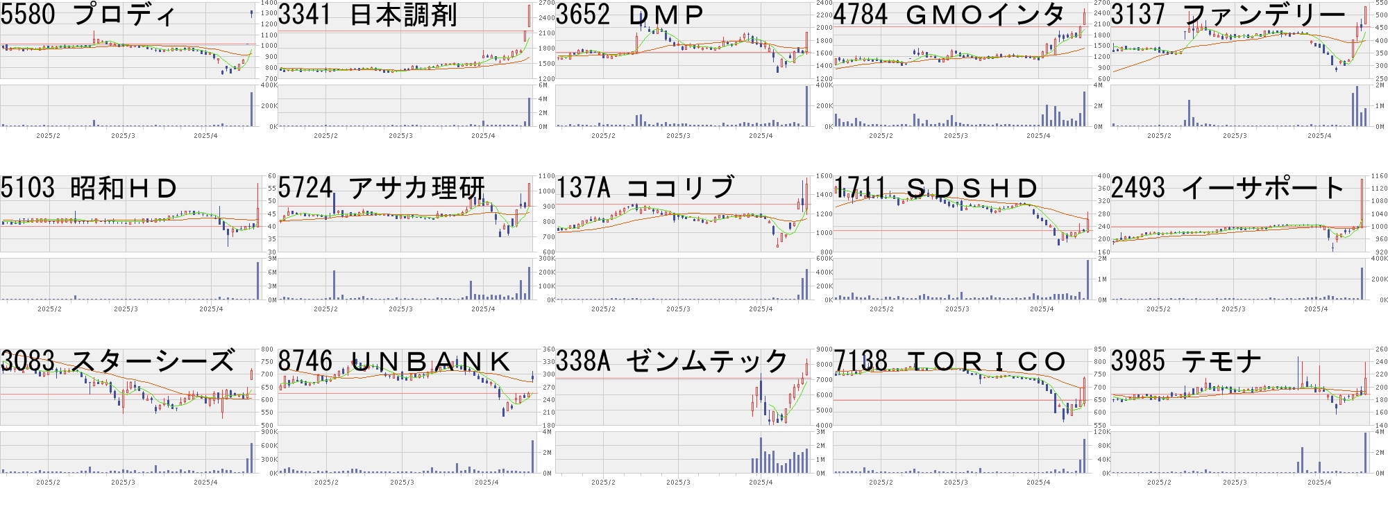 コード,銘柄名,市場,株価,前日比,前日比.1,出来高,PER,PBR,利回り5580,プロディ,東G,1300,282,+27.70%,324300,17.1,2.53,-3341,日本調剤,東P,2636,500,+23.41%,4004800,39.4,1.35,0.953652,DMP,東G,1930,323,+20.10%,384200,28.9,1.7,-4784,GMOインタ,東P,2406,390,+19.35%,3302900,131,127.0,0.763137,ファンデリー,東G,532,80,+17.70%,848100,177,12.09,-5103,昭和HD,東S,47,7,+17.50%,8036500,-,2.16,-5724,アサカ理研,東S,1047,150,+16.72%,230300,23.9,1.13,0.76137A,ココリブ,東G,1509,209,+16.08%,437200,24.2,5.45,-1711,SDSHD,東S,262,35,+15.42%,1888400,-,4.34,-2493,イーサポート,東S,1147,150,+15.05%,304100,41.6,1.44,0.443083,スターシーズ,東S,714,92,+14.79%,642400,-,3.58,-8746,UNBANK,東S,290,35,+13.73%,3068600,-,0.53,-338A,ゼンムテック,東G,8020,960,+13.60%,1726400,66.2,45.38,-7138,TORICO,東G,733,87,+13.47%,96900,-,1.17,-3985,テモナ,東S,214,25,+13.23%,3859800,71.3,3.32,-コード,銘柄名,市場,株価,前日比,前日比.1,出来高,PER,PBR,利回り3803,イメージ情報,東G,450.0,-58.0,-11.42%,208300,12.1,2.51,-8225,タカチホ,東S,3000.0,-370.0,-10.98%,87300,6.6,0.97,1.675241,日本オーエー,名N,1001.0,-119.0,-10.63%,21300,12.4,1.17,-5253,カバー,東G,2127.0,-239.0,-10.10%,16363600,27.4,9.32,-6866,HIOKI,東P,5750.0,-610.0,-9.59%,257300,12.1,1.97,3.48303A,visumo,東G,998.0,-103.0,-9.36%,375900,39.8,3.18,-6525,コクサイエレ,東P,2114.0,-196.0,-8.48%,5366500,14.8,2.62,1.707352,TWOST,東G,965.0,-89.0,-8.44%,1062600,72.3,12.35,0.059704,アゴーラHG,東S,76.0,-7.0,-8.43%,11732600,55.1,5.21,-3929,Sワイヤー,東G,234.0,-21.0,-8.24%,368900,16.1,1.85,-6323,ローツェ,東P,1375.5,-121.5,-8.12%,4448600,10.3,2.06,1.244100,戸田工,東S,986.0,-86.0,-8.02%,62400,-,0.41,-6146,ディスコ,東P,25975.0,-2260.0,-8.00%,6292400,24.9,6.22,1.425726,大阪チタ,東P,1497.0,-130.0,-7.99%,1686000,9.0,1.34,3.015255,モンラボ,東G,71.0,-6.0,-7.79%,1603900,15.8,-,-にほんブログ村