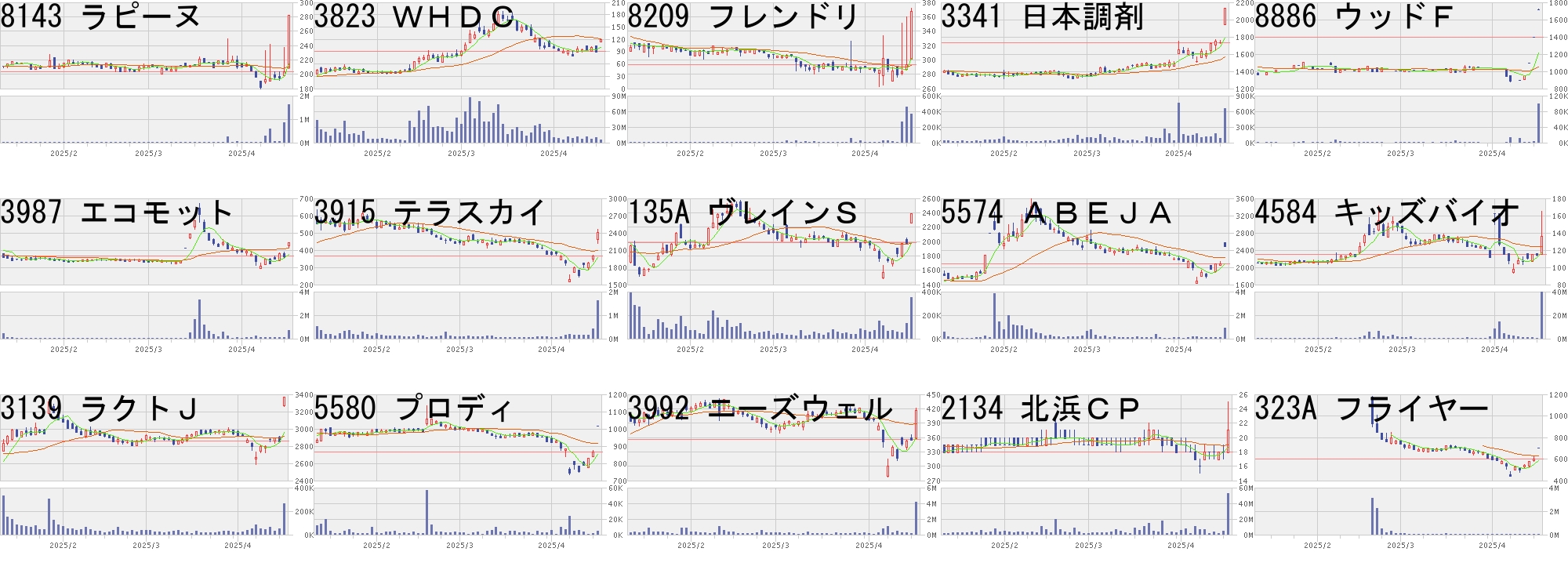 コード,銘柄名,市場,株価,前日比,前日比.1,出来高,PER,PBR,利回り8143,ラピーヌ,東S,313,80,+34.33%,976900,-,0.88,-4814,ネクスウェア,東S,184,43,+30.50%,12823100,232,1.96,-1757,創建エース,東S,29,6,+26.09%,12127700,-,30.21,-341A,トヨコー,東G,1580,300,+23.44%,3489100,127,15.76,-7774,Jティッシュ,東G,619,100,+19.27%,514500,-,4.39,-4784,GMOインタ,東P,3000,451,+17.69%,5944800,164,158.0,0.617271,安永,東S,535,80,+17.58%,19800,7.3,0.52,2.436233,KLASS,東S,463,68,+17.22%,1176100,14.3,0.86,2.167090,リグア,東G,1170,170,+17.00%,213800,-,3.61,-8119,三栄コ,東S,1080,150,+16.13%,170000,11.4,0.78,2.697057,エヌシーエヌ,東S,1239,171,+16.01%,80500,17.7,1.89,2.34338A,ゼンムテック,東G,11470,1500,+15.05%,1402300,97.8,67.04,-1967,ヤマト,東S,1600,203,+14.53%,456800,11.0,1.01,2.813137,ファンデリー,東G,799,100,+14.31%,847600,266,18.15,-8918,ランド,東S,8,1,+14.29%,56486300,17.4,1.38,-コード,銘柄名,市場,株価,前日比,前日比.1,出来高,PER,PBR,利回り4896,ケイファーマ,東G,838,-119,-12.43%,939700,-,4.31,-3823,WHDC,東S,105,-14,-11.76%,12148400,2100,7.74,-4506,住友ファーマ,東P,627,-81,-11.44%,32375300,15.6,1.50,-3409,北日紡,東S,156,-17,-9.83%,253600,-,4.03,-290A,Syns,東G,1273,-108,-7.82%,4347600,-,7.30,-3692,FFRI,東G,3145,-255,-7.50%,446400,57.5,10.93,0.324929,アジュバン,東S,765,-61,-7.38%,103500,84.0,1.47,1.575721,Sサイエンス,東S,88,-7,-7.37%,20166400,-,4.24,-3987,エコモット,東G,399,-31,-7.21%,354500,100,2.38,-7014,名村造,東S,1792,-138,-7.15%,5127500,5.7,1.23,1.954255,THECOO,東G,771,-59,-7.11%,56400,-,4.54,-4439,東名,東S,1914,-139,-6.77%,63600,14.3,3.30,0.783260,エスポア,名N,3440,-240,-6.52%,5400,-,-,-3416,ピクスタ,東G,935,-65,-6.50%,405000,10.2,1.44,4.815241,日本オーエー,名N,951,-66,-6.49%,7800,11.8,1.12,-にほんブログ村