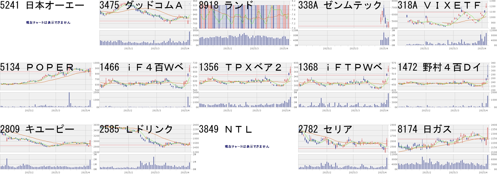 コード,銘柄名,市場,株価,前日比,前日比.1,出来高,PER,PBR,利回り5241,日本オーエー,名N,1311.0,300.0,+29.67%,35700,16.2,1.54,-3475,グッドコムA,東P,933.0,150.0,+19.16%,814400,7.1,2.16,4.828918,ランド,東S,8.0,1.0,+14.29%,48936900,14.0,1.40,-338A,ゼンムテック,東G,4885.0,610.0,+14.27%,1561900,40.3,27.64,-318A,VIXETF,東E,1197.5,102.5,+9.36%,967440,-,-,-5134,POPER,東G,895.0,62.0,+7.44%,93200,42.4,4.52,-1466,iF4百Wベ,東E,683.0,47.0,+7.39%,34356,-,-,-1356,TPXベア2,東E,371.7,24.5,+7.06%,6060990,-,-,-1368,iFTPWベ,東E,535.0,34.0,+6.79%,839274,-,-,-1472,野村4百Dイ,東E,271.0,17.0,+6.69%,153289,-,-,-2809,キユーピー,東P,3027.0,187.5,+6.60%,1877400,14.4,1.35,2.112585,Lドリンク,東P,1611.0,98.0,+6.48%,888100,21.9,6.05,0.703849,NTL,札A,560.0,33.0,+6.26%,700,60.2,0.80,1.792782,セリア,東S,2619.0,153.0,+6.20%,915100,19.1,1.87,2.678174,日ガス,東P,2363.5,124.0,+5.54%,852800,18.4,3.96,3.91コード,銘柄名,市場,株価,前日比,前日比.1,出来高,PER,PBR,利回り8518,アジア投資,東S,210,-65,-23.64%,3000000,-,0.67,-2334,イオレ,東G,980,-300,-23.44%,903300,-,10.08,-7036,EMネットJ,東G,748,-150,-16.70%,65300,35.7,2.06,-6967,新光電工,東P,7494,-1500,-16.68%,720400,56.3,3.63,-6786,RVH,東S,51,-10,-16.39%,1517200,-,1.36,-7318,セレンHD,東G,1480,-239,-13.90%,20200,2.4,0.80,-3224,Gオイスター,東G,670,-105,-13.55%,55800,24.6,2.92,1.49246A,アスア,東G,586,-89,-13.19%,289200,11.5,1.64,0.972721,JHD,東S,161,-24,-12.97%,126200,-,-,-3498,霞ヶ関C,東P,10960,-1620,-12.88%,1934000,10.8,3.88,2.195247,BTM,東G,866,-128,-12.88%,235100,50.8,3.67,-6914,オプテクスG,東P,1458,-214,-12.80%,682200,8.8,1.04,3.093409,北日紡,東S,151,-22,-12.72%,462300,-,3.90,-6469,放電精密,東S,1230,-179,-12.70%,215700,57.9,1.95,0.572435,シダー,東S,194,-28,-12.61%,494900,6.0,1.53,5.15にほんブログ村
