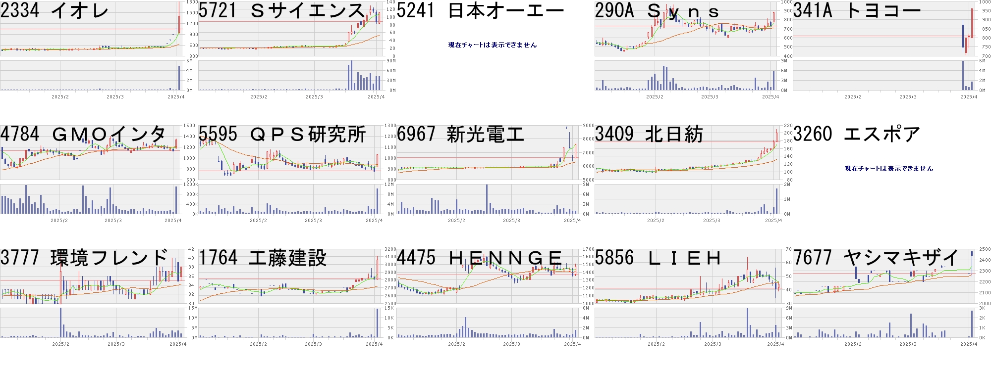 コード,銘柄名,市場,株価,前日比,前日比.1,出来高,PER,PBR,利回り2334,イオレ,東G,1401,360,+34.58%,4823500,-,14.42,-5721,Sサイエンス,東S,112,24,+27.27%,41308800,-,5.4,-5241,日本オーエー,名N,861,150,+21.10%,13900,10.6,1.01,-290A,Syns,東G,879,148,+20.25%,5604400,-,5.04,-341A,トヨコー,東G,960,150,+18.52%,1651500,77.7,9.58,-4784,GMOインタ,東P,1329,196,+17.30%,1081500,72.9,70.35,1.375595,QPS研究所,東G,1029,150,+17.06%,10173500,-,6.11,-6967,新光電工,東P,7605,1000,+15.14%,830500,57.1,3.68,-3409,北日紡,東S,200,22,+12.36%,1681300,-,5.17,-3260,エスポア,名N,3175,341,+12.03%,5000,-,136.0,-3777,環境フレンド,東G,38,3,+8.57%,1953900,-,3.48,-1764,工藤建設,東S,3055,237,+8.41%,14300,11.2,0.74,3.274475,HENNGE,東G,1477,114,+8.36%,1421500,42.8,14.65,0.275856,LIEH,東S,44,3,+7.32%,1493300,-,1.03,-7677,ヤシマキザイ,東S,2441,166,+7.30%,2700,57.9,0.72,1.02コード,銘柄名,市場,株価,前日比,前日比.1,出来高,PER,PBR,利回り4593,ヘリオス,東G,213,-58,-21.40%,7582600,-,10.46,-4584,キッズバイオ,東G,128,-34,-20.99%,14187900,-,5.68,-4499,スピー,東S,2039,-461,-18.44%,1125900,-,4.39,-338A,ゼンムテック,東G,4700,-1000,-17.54%,1542300,38.8,26.6,-4882,ペルセウス,東G,486,-100,-17.06%,5732700,-,4.59,-278A,テラドローン,東G,7750,-1500,-16.22%,784500,-,10.73,-3726,フォーシーズ,東S,628,-93,-12.90%,132000,897,5.43,-8783,GFA,東S,408,-57,-12.26%,2033300,17.4,6.16,-9704,アゴーラHG,東S,84,-11,-11.58%,25523400,60.9,5.75,-5616,雨風太陽,東G,1093,-143,-11.57%,222200,105,7.65,-9421,エヌジェイ,東S,552,-71,-11.40%,21200,73.0,1.88,-4222,児玉化,東S,424,-53,-11.11%,545200,-,0.82,-5247,BTM,東G,1122,-138,-10.95%,874500,65.8,4.75,-192A,インテG,東G,2622,-303,-10.36%,102900,6.4,2.94,-5845,全保連,東S,850,-97,-10.24%,162100,13.6,3.2,3.53にほんブログ村