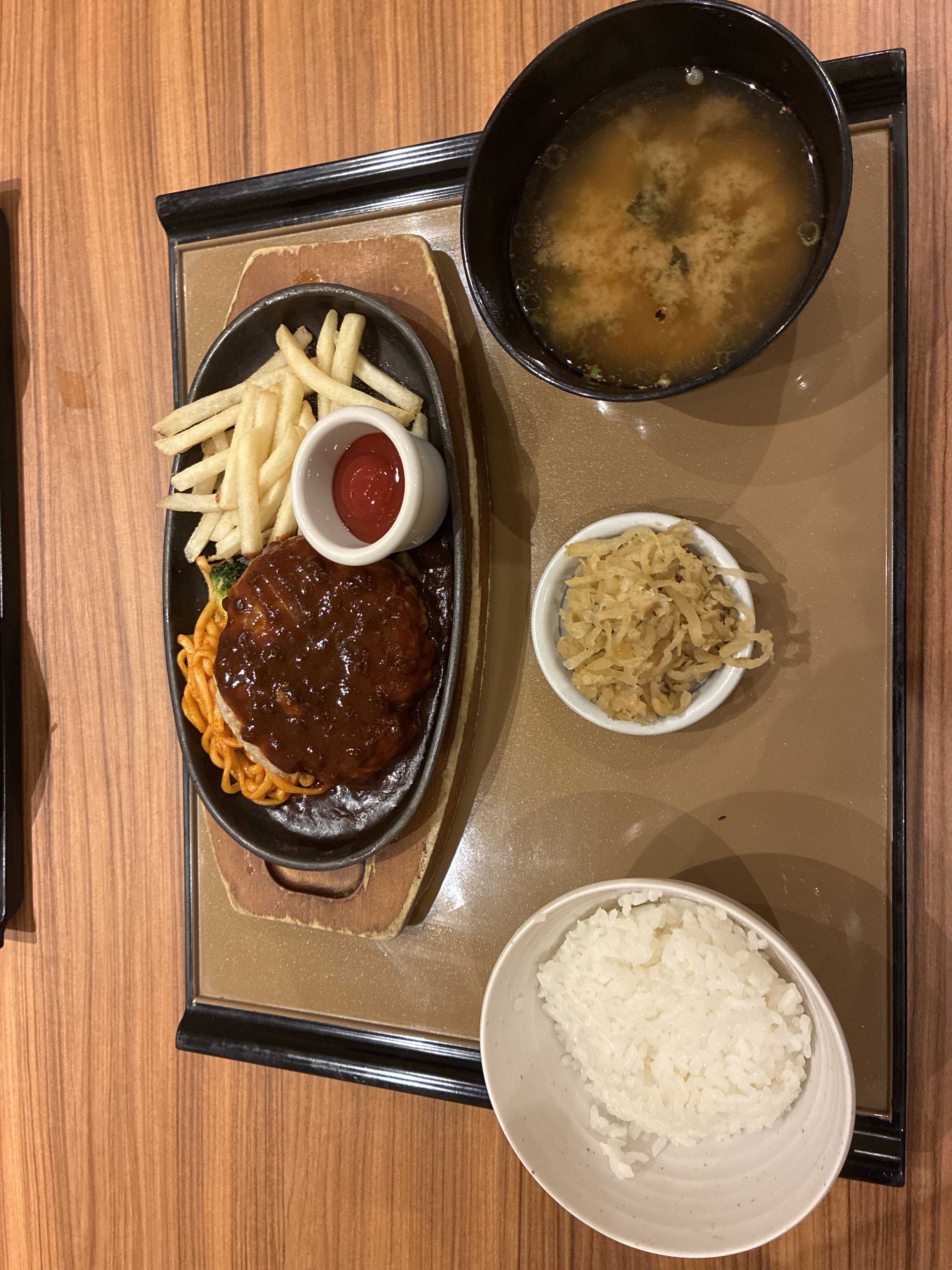 久しぶりにやよい軒でデミグラスハンバーグ定食食べます。美味しそうです。いただきます、