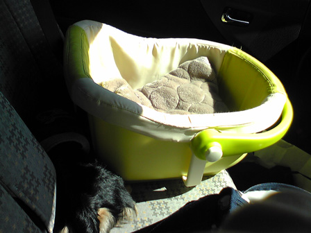 今日は、朝から娘の歯医者さん車で私ととのはお留守番外は風が強くて寒いけど・・・車の中はポカポカ私の車の中の、との用キャリーわかりますかぁ黒い物体・・・暑かったみたいで・・・ほら、必死で日陰に隠れてる しばらくすると・・・時間ずれのニワトリさんが「コケコッコ~~」って鳴き出して・・・何の声ですか 不思議そうに、何の声だか捜してるとのでした