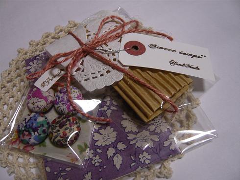 sweet tempsのmeguちゃんのwebショップでお買い物素敵にラッピングされて届きました。 本命の商品はこちら リバティの携帯ストラップ。最近取り替えた携帯にあわせてピンクにしました。でも重大なミス?が・・・ストラップつけるところが見つからない?エッ~~~~~~~~~~どこなの~いまだに見つけられない。ド○モの人にきいてみなきゃそして・・・・・meguちゃんのやさしい心遣いリバティのマグネットが一緒に送られてきました。 とっても可愛いです。大事につかいますね。ありがとうございました。